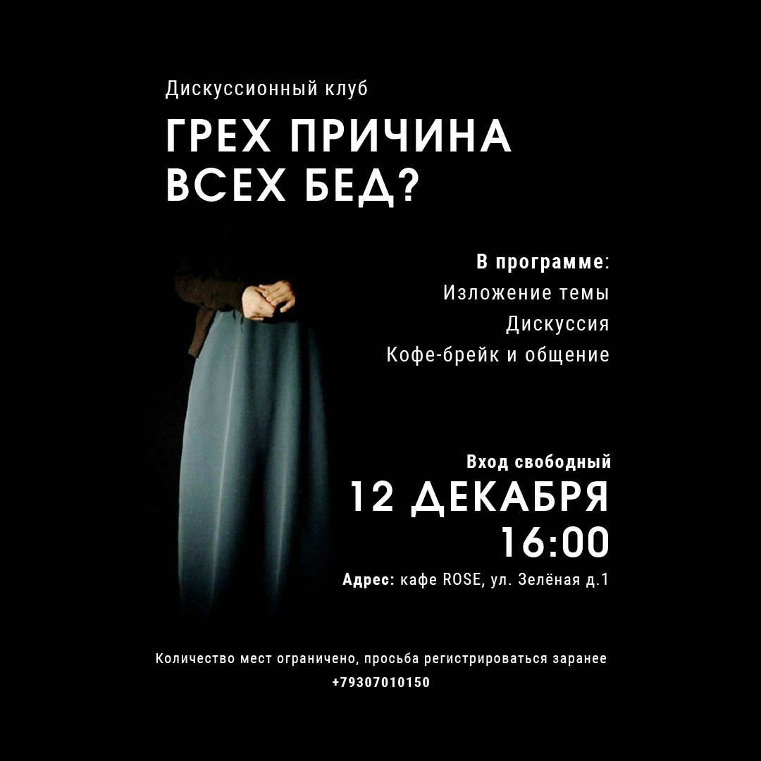 Дорогие друзья! Приглашаем посетить дискуссионный вечер на тему "Грех - причина всех бед?", который состоится 12 декабря в 16:00, по адресу Нижний Новгород, ул. Зеленая 1, кафе Rose.